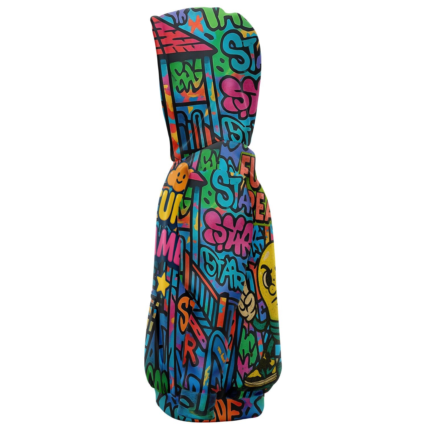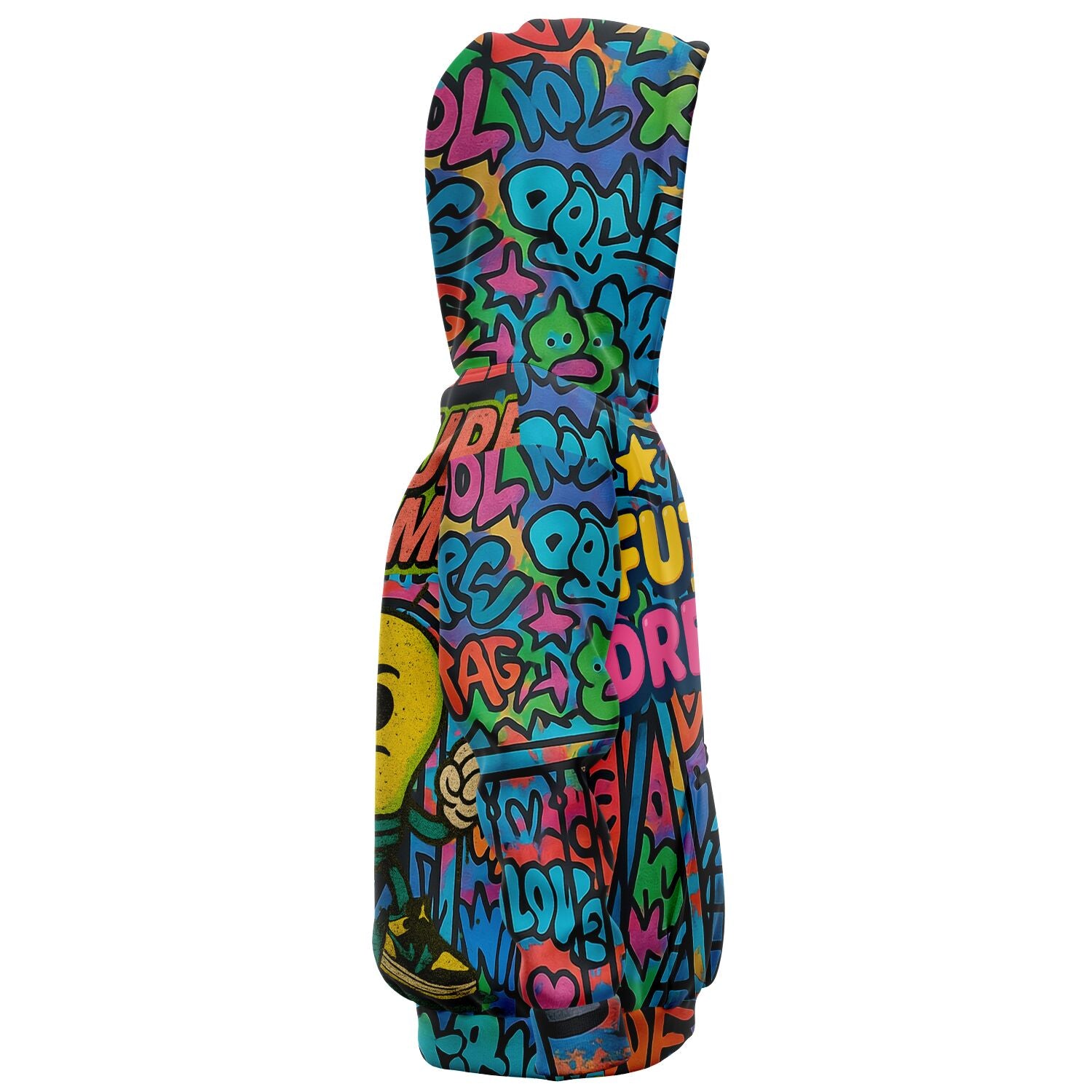 The all-over graffiti print feels like a wearable mural, bursting with bright colors and bold lines. On the front, the Future Dreamer logo shines in 3D pop style, while the back features the fearless mascot character—rocking sneakers, standing tall, and representing that wired-different energy.